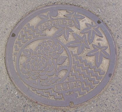 南河内町集落排水のマンホール。南河内町はモミジに菊。