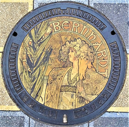 アール・ヌーヴォーを代表する画家アルフォンス・ミュシャの作品を多数所蔵する堺市が2020年12月に設置したミュシャのデザインマンホール。全12種類。「ジスモンダ」(編集部撮影)